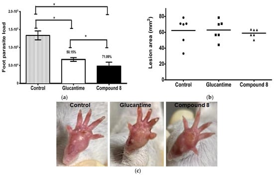 Footpad parasite load and lesion area in L. mexicana-infected mice treated with compound 8 and Glucantime. BALB/c mice were subcutaneously infected with 1 × 106 stationary promastigotes of L. mexicana. Compound 8 and Glucantime at 30 mg/kg were administered on day 49 pi via the intraperitoneal route on alternate days to complete seven administrations. (a) Footpads were aseptically removed one week after the end of treatment and parasite load was determined by limiting dilution * p ≤ 0.001. (b) Lesion areas were measured before the animals were sacrificed and determined as described in the methodology. (c) Macroscopic images of the footpad of infected animals: control mice and mice treated with Glucantime and Compound 8.