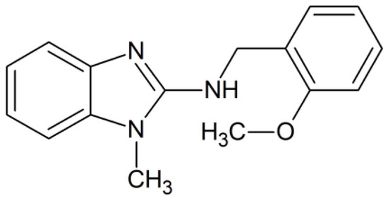 The synthesis of the N-(2-methoxyphenyl)-1-methyl-1H-benzimidazol-2-amine, compound 8, was prepared as previously described by our group [19]. The chemical structure of compound 8 is presented in Scheme 1.