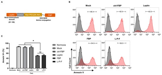 The inhibitory effect of FBP or leptin-PEG-FBP (L-P-F) on FasL-induced apoptosis in hypoxic-N2a. (A) Schematic illustration of the L-P-F peptide synthesis. (B,C) The N2a cells were cultured in a hypoxic condition in the presence of membrane-bound soluble FasL (5 nM) for 6 h, as described in the Methods section. The cells were then treated with 300 μM of the indicated peptides for 6 h and examined for Annexin V-PE staining. (B) Representative histograms illustrate the percentage of apoptosis with the peptide treatments, depicting live cells (in black) and apoptotic cells (in red). (C) Bar graph represents the percentage of Annexin V positive cells with the peptide treatments. Normoxia describes cells cultured in normal oxygen conditions. Hypoxia describes cells cultured in hypoxic conditions. The bar graph indicates the average ± SD of three independent experiments. The data in (C) was analyzed using Mann–Whitney U test (* p < 0.05; ns: not-significant).