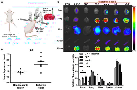 Systemically delivered leptin-PEG-FBP (L-P-F) localizes to Fas-expressing brain regions in the photothrombotic mouse model of ischemia. (A) Schematic illustration of the photothrombotic stroke model. (B) mRNA quantification of Fas expression in non-ischemic and ischemic region of photothrombotic stroke mouse brain, normalized to GAPDH. Data represent the average ± SD of three independent experiments from n = 5. (C) The representative images and quantification of fluorescence intensity in indicated organs after necropsy. Alexa647-labelled peptides were systemically delivered (i.v.) to control and ischemic mice, and organs were collected at 12 h post-injection, imaged on Kodak imaging station. Control mice were inoculated with PBS or leptin-PEG-FBP. Fluorescence was labeled on FBP in both leptin-FBP (L-F) and in leptin-PEG-FBP (L-P-F). Fluorescence intensities, measured in arbitrary pixel values, were normalized to intensities in the PBS-treated group. Data represent mean ± SD (n = 5 per group). The data in (B) and (C, bottom) were analyzed using Mann–Whitney U test (* p < 0.05).
