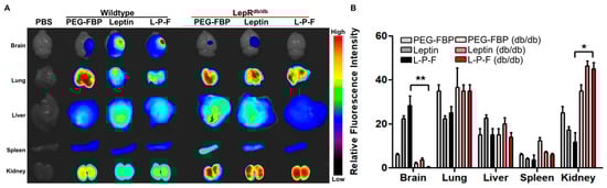 Leptin–leptin receptor binding facilitates Leptin-PEG-FBP delivery to the brain. Wildtype and leptin receptor-deficient (db/db) mice were subjected to photothrombotic stroke, followed by administration of the indicated peptides (2.5 mg/kg Alexa647-labelled peptides, i.v.). Organs were collected at 12 h post-delivery and imaged on Kodak imaging station. (A,B) Representative images and quantification of fluorescence intensities after necropsy. Control mice were inoculated with PBS. Fluorescence intensities measured in arbitrary pixel values were normalized to fluorescence intensities in the PBS-treated group. The data represent mean ± SD (n = 5 per group). The data in (B) were analyzed using Mann–Whitney U test (* p < 0.05; ** p < 0.01).