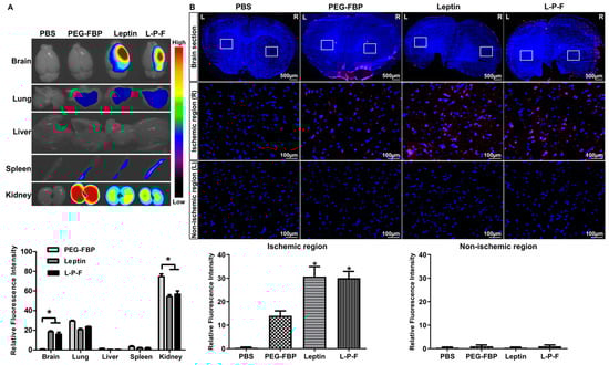 Systemic delivery of leptin-PEG-FBP targets the ischemic region in the brain of MCAO rat model. Rats underwent middle cerebral artery occlusion, followed by the administration of the indicated Alexa647-labelled peptides (2.5 mg/kg, i.v.). Organs were harvested 24 h post-inoculation and imaged on Kodak imaging station. (A) Representative images and quantification of fluorescence intensities after necropsy. Control mice were inoculated with PBS. Fluorescence intensities measured in arbitrary pixel values were normalized to the intensities of the PBS-treated group. (B) Representative confocal microscopy images (lower panel) from brain sections (upper panel) show localization of Alexa647-labelled peptides (red) and DAPI-stained nuclei (blue) in MCAO brain tissues. FBP was exclusively labelled in both PEG-FBP and leptin-PEG-FBP. Data were analyzed using Mann–Whitney U test. Data represent the mean ± SD (* p < 0.01).