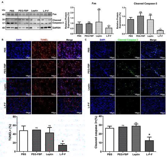 Ischemic stroke conditions in rat MCAO models lead to brain damage primarily through apoptosis [24]. To assess the therapeutic effects of leptin-PEG-FBP on Fas-mediated apoptosis, we administrated 5 mg/kg of FBP systemically at 3 h and 6 h post-MCAO. At 48 h post-MCAO, we conducted necropsy to estimate the protein levels of Fas and cleaved caspase-3 in the brain samples. Ischemic stroke induced an elevated level of Fas and cleaved caspase-3, similar to the PBS-treated MCAO rats. However, the leptin-PEG-FBP treatment resulted in a 50% reduction in Fas expression and an 80% reduction in downstream cleaved caspase-3 expression compared to that of PEG-FBP and that of leptin-treated MCAO rats (Figure 5A). Furthermore, confocal microscopy data revealed higher levels of TUNEL-positive cells in the ischemic region at 48 h post-MCAO. Approximately 52% of cells were TUNEL-positive in the PBS-treated group, 55% in the PEG-FBP, and 47% in the leptin-treated group (Figure 5B). However, leptin-PEG-FBP treatment significantly reduced the number of TUNEL-positive cells to 18%. Consistent with Western blot data, the immunohistochemistry of the brain demonstrated an elevated expression of cleaved caspase-3 in the ischemic region. Approximately 26% of cells were caspase-3 positive in the PBS-treated group and these levels were reduced by 12% in the leptin-PEG-FBP-treated group (Figure 5C). As expected, there were no significant changes in the TUNEL assay of cleaved caspase-3 positive cells in the leptin- and PEG-FBP-treated MCAO rats. Our data demonstrate that leptin-PEG-FBP can lower the activity of Fas and downstream signaling, thereby reducing apoptosis in the MCAO rat model.