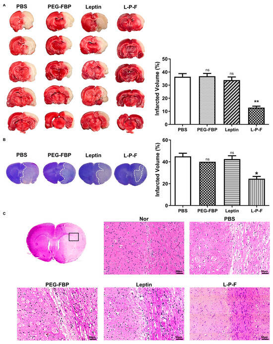 The induction of apoptosis in the penumbra after MCAO results in brain damage, leading to the formation of infarcts or areas of tissue damage [9]. To examine the impact of leptin-PEG-FBP on brain infraction, we conducted triphenyltetrazolium chloride (TTC) staining at 48 h post-treatment. The infarct size significantly expanded to almost the entire right hemisphere of the brain within 48 h post-MCAO in the PBS-, PEG-FBP-, and leptin-treated groups, with an infarction volume of 37%, 35%, and 32%, respectively (Figure 6A). However, the leptin-PEG-FBP treatment significantly reduced the infarct area by approximately 70% compared to that of the PBS treatment. Additionally, Nissl-stained brain slices revealed substantial apoptosis in neuronal cells on the right side of brain slice in PBS-, PEG-FBP-, and leptin-treated rats (Figure 6B) compared to that of the rats treated with leptin-PEG-FBP. The leptin-PEG-FBP-treated group exhibited approximately a 20% infarction volume, while rats treated with PBS, PEG-FBP, or leptin consistently showed around a 45% infarction volume (Figure 6B). Both TTC and Nissl-staining data indicated that approximately 50% of brain cells were recovered in the leptin-PEG-FBP-inoculated group. Hematoxylin and eosin (H&E) staining of brain sections also revealed significant damage to the tissue morphology in the right hemisphere of the brain in PBS-, PEG-FBP-, and leptin-treated rats (Figure 6C). In contrast, tissue damage was reduced and highly attenuated in the leptin-PEG-FBP-inoculated group. Our data demonstrate that the leptin-PEG-FBP treatment can rescue brain cells from brain damage.