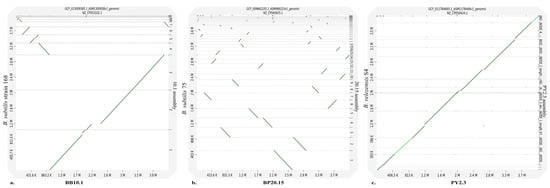 Synteny analysis of (a) BB10.1, (b) BP20.15, and (c) PY2.3. Pairwise genome alignment for the selected strains is shown in the dot plots generated by D-GENIES tool.