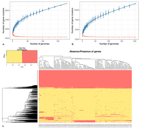 Representation of (a) BB10.1 and BP20.15 pan-genome and (b) PY2.3 gene content (extrapolated median-based line) according to how the pan-genome varies as genomes are added in random order to the analysis. The blue line represents unique genes; the red line represents new genes. The heatmap (c) represents the presence and absence of particular genes in BB10.1 and BP20.15 pan-genome. The X-axis denotes the particular species name. The yellow color indicates gene presence; the red color indicates gene absence. The Y-axis represents individual gene clustering, while the topmost axis represents genomes clustering (high-quality figure in Supplementary File).