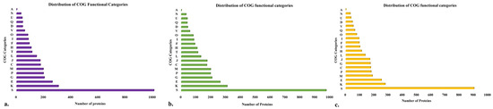 Distribution of cluster of orthologous group (COG) functional categories to the proteins of isolate (a) BB10.1; (b) BP20.15; (c) PY2.3. The X-axis denotes the number of proteins and Y-axis denotes COG categories. Each alphabet represents a unique COG category. A—RNA processing and modification, C—energy production and conversion, D—cell cycle control, cell division, and chromosome partitioning; E—amino acid transport and metabolism; F—nucleotide transport and metabolism; G—carbohydrate transport and metabolism; H—coenzyme transport and metabolism; I—lipid transport and metabolism; J—translation, ribosomal structure, and biogenesis; K—transcription; L—replication, recombination, and repair; M—cell wall/membrane/envelope biogenesis; N—cell motility; O—post-translational modification, protein turnover, chaperones; P—inorganic ion transport and metabolism; Q—secondary metabolites biosynthesis, transport, and catabolism; S—function unknown; T—signal transduction mechanisms; U—intracellular trafficking, secretion, and vesicular transport; and V—defense mechanisms.