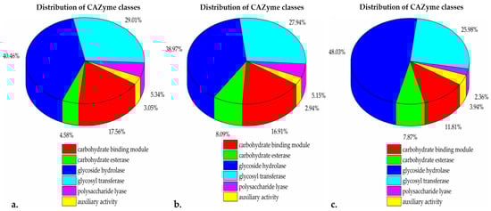 The percent distribution of CAZymes classes. (a). BB10.1, (b). BP20.15, (c). PY2.3. The color scheme at the bottom represents different CAZyme classes: red, CBM—carbohydrate-binding module; green, CE carbohydrate esterases; blue, GH—glycoside hydrolases; cyan, GT—glycosyl transferases; pink, PL—polysaccharide lyases; and yellow, AA—auxiliary activity.