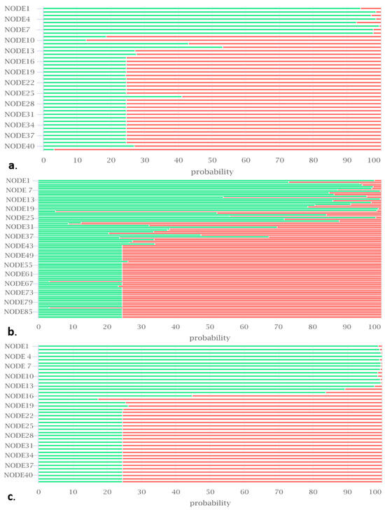 The predicted probability of probiotic genes in the genomes of isolates (a) BB10.1, (b) BP20.15, and (c) PY2.3. The green color indicates probiotic genes, and the red color indicates non-probiotic genes. The x-axis values (0–100) represent the probability of a gene being a probiotic gene. The y-axis represents the contig number in the genome.