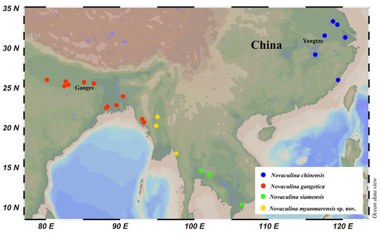 - Win, T.; Bolotov, I.N.; Vikhrev, I.V.; Lunn, Z.; Chan, N.; Konopleva, E.S.; Gofarov, M.Y.; Tomilova, A.A.; Kondakov, A.V. Phylogeography and Distribution of the Freshwater Razor Clams Novaculina myanmarensis and N. Gangetica in Myanmar, with Notes on Two Doubtful Nominal Taxa Described as Novaculina Members (Bivalvia: Pharidae). Ecol. Monten. 2021, 40, 59–67. [Google Scholar] [CrossRef]