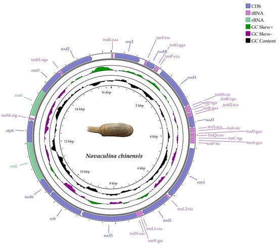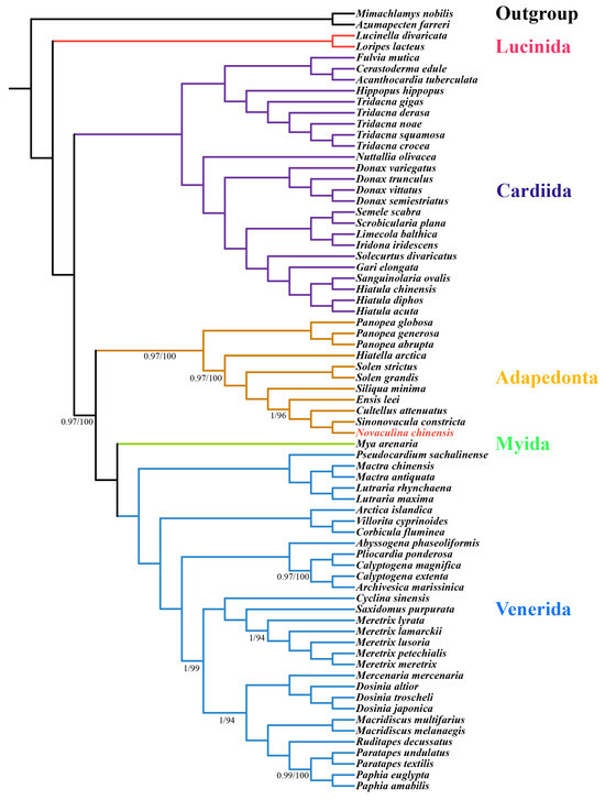 The superorder Imparidentia is a newly defined branch of bivalves encompassing diverse clades of marine, brackish, and freshwater bivalve mollusks [12]. It includes five major lineages: Lucinida, Cardiida, Adapedonta, Myida, and Venerida [2]. However, the phylogenetic relationship of N. chinensis in Imparidentia is not clear due to it not being analyzed before. The mitochondrial genome (mitogenome) of classic metazoans is a small and compact circular molecule that typically includes 13 protein-coding genes (PCGs), 2 ribosomal RNA genes (rRNAs), and 22 transfer RNA genes (tRNAs), with the exception of bivalve shellfish in which loss of the atp8 gene is observed in some species [13,14]. The complete mitochondrial genome has been widely used for studying the phylogenetic reconstruction and adaptative evolution due to its maternal inheritance, low intermolecular recombination, high copy number, and high replacement rate [2,15,16].