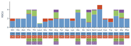 Most invertebrates utilized two to four codons to encode its amino acids [26]. The nucleotide relative synonymous codon usages (RSCUs) of N. chinensis are presented (Figure 3, Table 3). UUA (Leu2), GCU (Ala), CCU (Pro), and UCU (Ser) are the most frequently used codons, whereas CUC, CUG (Leu1), AUC (Ile), and GUC (Val) are relatively scarce. As per the RSCU values, codons ending with an A or T were preferred. The two most frequent amino acids in the PCGs of N. chinensis were Ser and Leu.