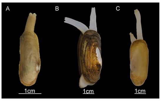 - Audino, J.A.; Serb, J.M.; Marian, J.E.A. Phylogeny and Anatomy of Marine Mussels (Bivalvia: Mytilidae) Reveal Convergent Evolution of Siphon Traits. Zool. J. Linn. Soc. 2020, 190, 592–612. [Google Scholar] [CrossRef]