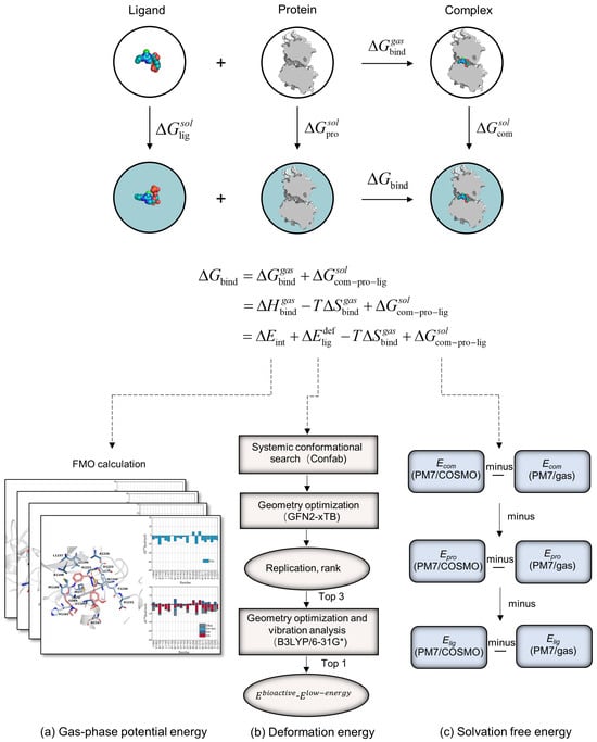 Computer-aided drug design (CADD) strategies have become an indispensable tool in modern drug discovery and development, with the primary objective of structure-based drug design being the prediction of protein–ligand binding affinity [1,2,3,4]. The accuracy of binding affinity predictions is essential in rationalizing potency, selectivity, and computational drug design. Currently, various strategies have been proposed to predict protein–ligand binding affinities, including low-end empirical scoring functions (SFs) [5], molecular mechanics/Poisson–Boltzmann (generalized Born) surface area (MM/PB(GB)SA) methods [6,7], and theoretically rigorous free energy perturbation (FEP) [8] and thermodynamic integration (TI) [9,10]. However, these force field-based molecular mechanics calculation methods are limited by their ability to accurately capture weak interactions (CH–π, Cl–π, cation–π) in inter- and intra-biomolecules without rigorous testing. In contrast, quantum mechanics (QM) can describe the behavior and structure of electrons and derive the properties of substances [11]. However, applying QM methods toward large biomolecular systems has been computationally quite expensive.