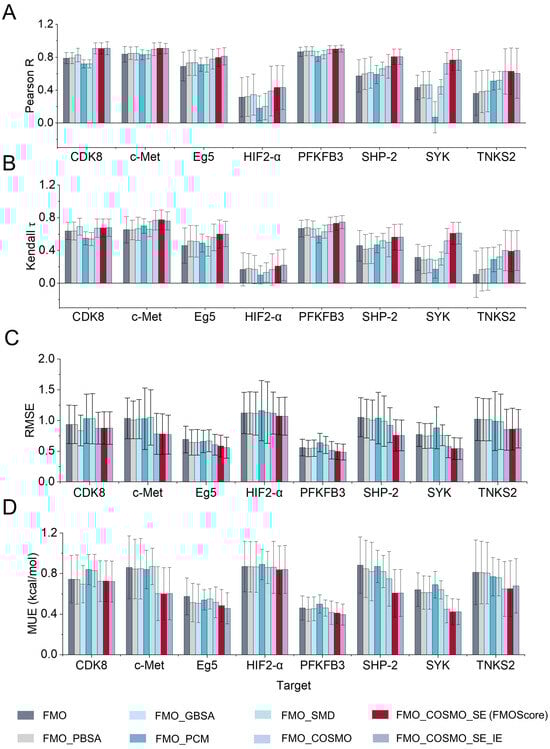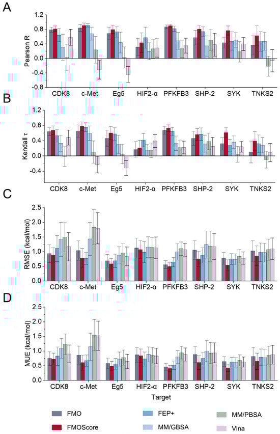 Figure 4. Performance comparison of FMOScore and traditional binding free energy calculation methods. (A) Pearson correlation coefficient R. (B) Kendall τ. (C) Root-mean-squared error (RMSE). (D) Mean unsigned error (MUE). The error bars indicate the 90% confidence interval by bootstrap with 10,000 resampling events.