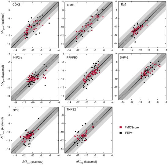 Figure 3. Prediction results of FMOScore in the Schrödinger FEP+ benchmark. ΔG values are predicted by FMOScore in red dots and FEP+ in dark dots. Predictions within 1 and 2 kcal/mol of the experimental affinity are highlighted by dark and light gray areas, respectively.