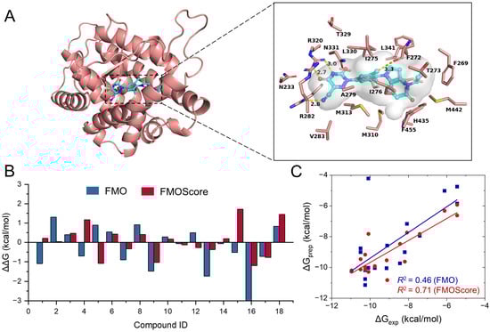 Figure 5. (A) Predicted binding pose of representative THR-β agonist (compound 12) in human THR-β ligand-binding domain (PDB code: 1N46). Key residues are shown in stick. (B) Differences between FMOScore-based predictions, FMO-based predictions, and ΔGexp for THR-β. (C) Correlations between experimentally measured affinities and ΔG values predicted by FMOScore (red dots) and FMO (blue square) for the THR-β agonists.