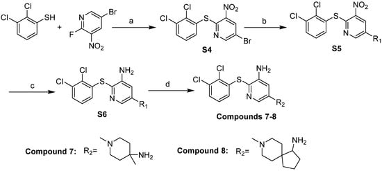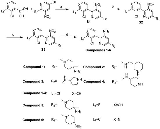 The synthesis of compound 18 and intermediate S1–S6 is shown in Scheme 1 and Scheme 2. Firstly, substituted phenylboronic acid and 2,5-dibromo-3-nitropyridine underwent a Suzuki coupling reaction catalyzed by palladium afforded intermediate S1. Then, S1 reacted with substituent amines to obtain intermediate S2. Subsequently, S2 was deprotected to remove the Boc group and then reduced by iron powder to obtain the final compounds 1~6 (Scheme 1). The initial step in the synthesis of compounds 78 involved a reaction between 3-dichlorophenol and 5-bromo-2-fluoro-3-nitropyridine, yielding intermediate S4. Then, S4 underwent the Suzuki coupling reaction with the corresponding substituted amine to obtain intermediate S5. Finally, S5 reduced the nitro group to an amino group by iron powder reduction, and then removed the Boc group to obtain the final compounds 7~8 (Scheme 2).