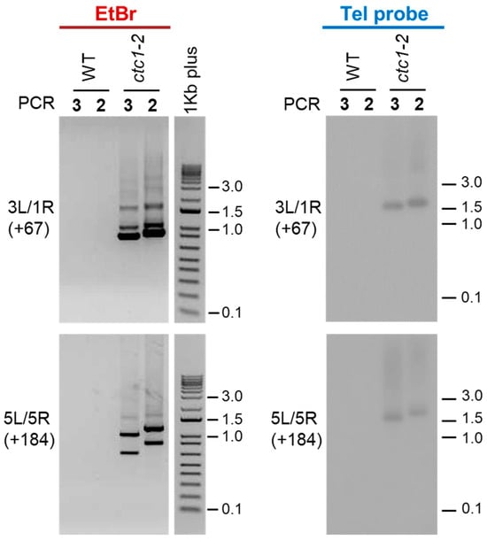 To differentiate between fusion events containing or lacking telomeric repeats, we decided to hybridize the 3L/1R and 5L/5R PCRs 2 and 3 products with a telomeric probe. Whereas no signals were detected after hybridization of the WT PCR products, smears and shifted bands of the expected sizes were detected after hybridization of the ctc1-2 products (Figure 2, right panels). However, some of the ctc1-2 PCR bands detected with ethidium bromide were not observed when the same bands were hybridized with the telomeric probe. Thus, our results are in agreement with previously reported data showing that most fusion events in ctc1 mutants contain subtelomeric sequences but lack telomeric repeats [25,31].