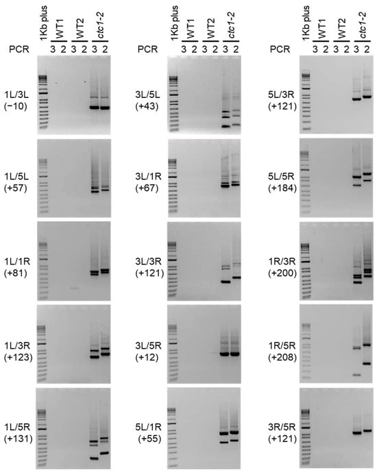 To further analyze the instability phenotype of the ctc1-2 mutant, we decided to study whether the rest of the telomeric regions present in chromosomes 1, 3 and 5 fuse among them. In general, we did not detect PCR products after ethidium bromide staining when amplifying WT DNA, although some PCR bands that were only observed in PCRs 2 or 3 or that did not shift as expected could be eventually amplified. In turn, we detected PCR products for all possible combinations of the telomeric regions when amplifying ctc1-2 DNA (Figure 3). Since the sizes of the smears and PCR bands shifted according to the positions of the subtelomeric primers in all cases, we concluded that all the telomeric regions analyzed fuse among them in ctc1-2, which we have verified for specific combinations of telomeric regions by sequencing some of the corresponding PCR bands (Supplementary Figure S1). These results highlight the low background levels of the technique and support that telomere fusions in ctc1-2 are not limited to specific combinations of telomeric regions.
