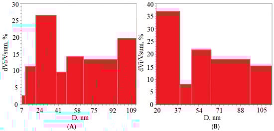 Pore size distribution relative to total volume (A–S5_HT_AHT100_V100_T550, B–S6_HT_AHT100_V100_T550).