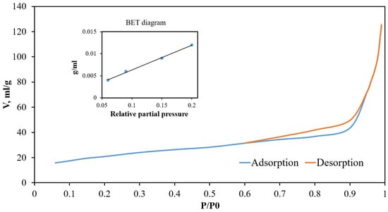 According to the IUPAC classification [38], the adsorption and desorption isotherm curve (Figure 2) can be classified as a type V isotherm, a type III isotherm variation that shows hysteresis caused by capillary condensation on mesoporous materials, aligning with the aforementioned results. This isotherm type shows weak adsorbate–adsorbent interactions; therefore, insignificant adsorption is observed at the initial site of the isotherm. Adsorption increases as the surface becomes filled with adsorbed molecules, as the adsorbate molecules have a stronger interaction with each other than with the adsorbent surface. The hysteresis can be classified as type C, which indicates wedge-shaped pores with open ends.