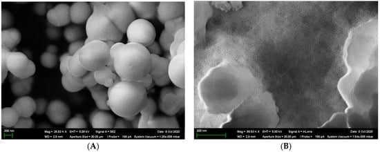 SEM images of SiO2 samples from TCS ((A) toluene; (B) hexane).