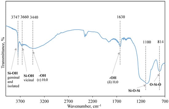 Figure 4 shows the IR spectrum of the S6_HT_AHT100_V100_T550 sample; isolated and geminal Si-OH groups are presented, and a peak is observed at 3747 cm−1. A peak in the region of 3660 cm−1 confirms the presence of vicinal Si-OH groups linked by hydrogen bonds. The wide band presence near 3440 cm−1 specifies -OH stretching vibrations. Water vibrations are observed in the area of 1630 cm−1. Stretching asymmetric vibrations of Si-O-Si and O-Si-O are observed at 1100 cm−1 and 814 cm−1, respectively. The obtained results lead to the conclusion that the condensation between Si-OR groups was successful.
