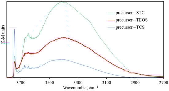 The Kubelka–Munk theory adequately explains the dependence of the diffusely reflected light intensity and the medium optical characteristics. The intensity of adsorbate bands in the Kubelka–Munk (K-M) function units is directly related to the adsorbate molecules’ concentration. Figure 5 shows the IR spectra of DRIFTS in K-M units of the previously studied silica samples obtained from STC and TEOS [35], in comparison with the samples from TCS researched in this work.