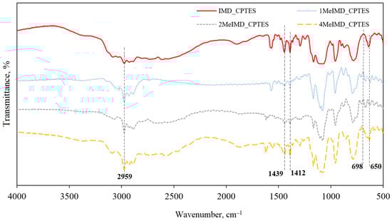 Supported ILs have great potential as catalysts because they offer the ability to adjust the catalyst surface extensively through modification of the organic cation. This allows for the utilization of the versatility of ionic liquids in heterogeneous catalysis. As already mentioned, the SiO2 functionalization was provided using the SILP technology. For this, the synthesis of ILs based on imidazole, 1-methylimidazole, 2-methylimidazole and 4-methylimidazole was performed. Imidazolium-based SILPs, stabilized on divinylbenzene and chloromethylstyrene catalyst supports, were selected because of their high catalytic activity in the Union Carbide process [17]. DRIFTS was used to evaluate the synthesis effectiveness (Figure 6). The broad C-Cl bond band absence at 698 cm−1 due to the chlorine transition to the anion indicates the success of the IL synthesis. C-H vibrations can be observed at 2959 cm−1. The bands of about 1439 and 1412 cm−1 were attributed to the C-H vibrations of CH2 groups—symmetric and asymmetric vibrations. The absorption bands appearing at 650 cm−1 were attributed to the stretching of CH2-Si.
