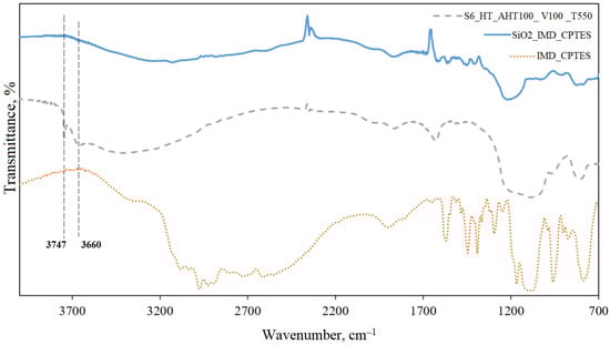 Next, the synthesized ILs were immobilized on the porous support, and DRIFTS was used to evaluate the immobilization success. Figure 7 shows the IR spectra of the S6_HT_AHT100_V100_T550 silica sample, the IMD_CPTES IL and the SiO2 sample after IMD_CPTES immobilization.