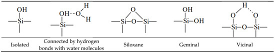 Since the immobilization of ionic liquids to the silica surface occurs through silanol groups, an important characteristic of such supports is their concentration. Silanol groups in silica are located both on the outer surface and in the material’s deeper layers. Surface groups, because of their accessibility, are important for IL immobilization. Their high activity is associated with their weak acid nature, due to which the proton easily enters exchange reactions. Besides isolated silanol groups, other group types can be present on the silica surface in different proportions (Figure 8) [39].