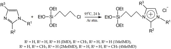 SiO2 functionalization was carried out using SILP technology (Figure 9). For this, 4 ionic liquids based on imidazole (IMD), 1-methylimidazole (1MeIMD), 2-methylimidazole (2MeIMD) and 4-methylimidazole (4MeIMD) were synthesized. They were mixed in a 1:1 molar ratio with 3-chloropropyl-triethoxysilane (CPTES) per 2 g of finished IL. IMD (1MeIMD, 2MeIMD or 4MeIMD) and CPTES were mixed in a 50 mL two-neck round-bottom flask filled with argon in the proportions shown in Table 4. The flask was placed in an oil bath with a magnetic stirrer, and a reflux condenser was connected. The synthesis was carried out under argon at 95 °C with stirring at 350 rpm for 24 h. Afterward, the product was cooled to room temperature and extracted twice with a double excess of diethyl ether. The resulting ILs were placed in a desiccator at room temperature under vacuum for 24 h. Table 1 shows the concentrations, densities and molar masses of the synthesized ILs.