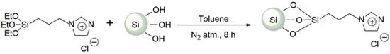 The synthesized ILs were immobilized onto a porous support prepared by TCS (Figure 10). This involved adding 1 g of mesoporous silicon dioxide, 10 mL of toluene and 5 mL of IMD-CPTES IL into a 100 mL flask filled with an inert gas (nitrogen). The mixture was stirred for 8 h at room temperature, and then the product was washed with toluene in a Soxhlet apparatus for 24 h and placed in a vacuum to eliminate any solvent residues for 48 h.