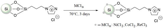 For the bifunctional catalysts’ synthesis, the received SILPs were placed in saturated solutions of the corresponding metal chlorides (nickel, rhenium, cobalt) in ethyl alcohol, and the mixture was heated to 70 °C for 3 days (Figure 11). The resulting catalysts were filtered, washed with ethyl alcohol, and, to remove excess metal chloride, washed with acetone in a Soxhlet apparatus for 2 days. A notable indicator of the successful synthesis was a significant decrease in the chloride ion content after immobilization, determined by chloride ion titration with a standard solution of AgNO3. In addition, X-ray diffraction analysis confirmed the success of the synthesis.