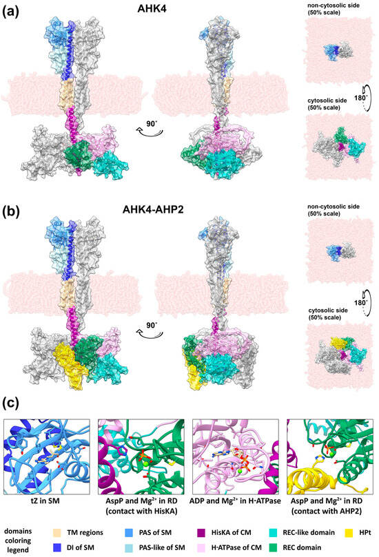Models of the full-length CK receptors obtained using ColabFold and embedded in the membrane in the YASARA Structure software. General view of the dimer of full-length AHK4 in HPt-free form (a) and in complex with two AHP2 proteins (b), presented in ribbon view with a semitransparent surface overlay. The N-terminal fragments of AHK4 up to the first TM domain have been removed. Hydrogen atoms have also been removed. Both models are presented in four projections: “front” (left), “side” (center), “top”, i.e., looking at the non-cytosolic side (facing the ER lumen or apoplast) of the membrane (top right), and “bottom”, i.e., looking at the cytosolic side of the membrane (bottom right). The “top” and “bottom” views have a scale of 50% relative to the “front” and “side” views. (c) Highlighted active sites of the AHK4 dimer and the AHK4–AHP2 complex with ligands: tZ in SM; phosphoaspartate (AspP) and Mg2+ in RD (in contact with HisKA); ADP and Mg2+ in the H-ATPase domain; AspP and Mg2+ in RD (in contact with AHP2). The viewing angles have been changed relative to (a,b) for better visualization. The surface and hydrogen atoms have been removed.