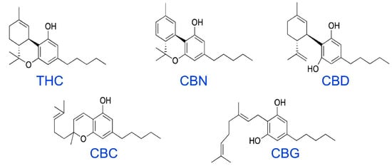 The primary psychoactive substance in cannabis, Δ-9-tetrahydrocannabinol (THC), is responsible for many of the strong effects that users seek. THC comes from the resin produced by the leaves and buds of the flowers of the female cannabis plant. Cannabidiol (CBD) is another common cannabinoid (Figure 1), but it produces mild to no psychoactive effects compared to THC []. THC affects the body variously, depending on how it is consumed. When inhaled, THC is released into the bloodstream from the lungs and quickly travels to other areas of the body, including the brain. This leads to calming, a sense of ecstasy, relaxation, amplified sensory perception, laughter, altered perception of time, and increased appetite. When ingested through foods or drinks, the effects are delayed from 30 min to 1 h as the drug passes through the digestive system into the blood. A considerably lower amount of THC enters the bloodstream in a given period when eaten or drunk rather than smoked. This can lead people to consume a greater quantity of the chemical as concentrations gradually increase, causing some individuals unwanted effects of anxiety, fear, distrust, or panic [].