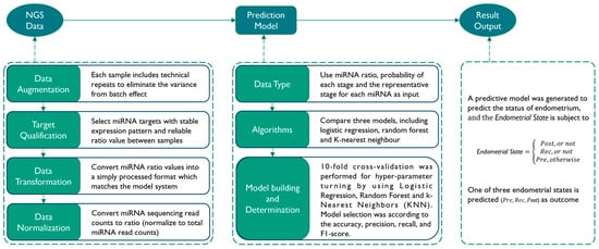 Based on the miRNA expression profiles of 111 blood samples, we next attempted to establish a prediction model that was able to distinguish three stages of endometrial status (Pre, Rec, and Post). The data analysis process and the factors taken into consideration are described in Figure 1. Briefly, the analysis combined a series of bioinformatics analysis, data processing, model training, and evaluation steps to build an in-house machine learning pipeline for classifying specimens into different endometrial receptivity statuses. We performed 10-fold cross-validation for hyper-parameter turning by using Logistic Regression, the Random Forest Classifier, and k-Nearest Neighbors (KNN). A prediction model was selected by analyzing the results from different combinations of the factors and algorithms. The overall accuracy of this prediction model is 91.9% (Table 1).
