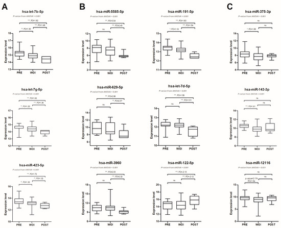 Differentially expressed miRNAs among different endometrial receptivity statues. According to the expression levels of miRNAs in different statuses, miRNAs can be classified into three conditions: miRNAs expressed with decreasing expression levels from Pre group to Rec group and further to Post group (A); miRNAs in the Post group exhibited differential expression levels compared to the other two groups (B); and differentially expressed miRNAs between Pre and Rec groups (C). The expression level of each miRNA is determined by first obtaining the ratio of miRNA reads to total miRNA reads, and then multiplying the ratio by 1,000,000. Finally, the resulting value is calculated by taking a log2 transformation. For each box plot, the medians are shown as a black horizontal line in the box, where the box represents the upper and lower quartiles. The upper and lower whiskers show the maximum and minimum, respectively. Significant post hoc comparisons are represented by asterisks. * p-value < 0.05; ** p-value < 0.01; *** p-value < 0.001; ns: no significance, FC: fold change.
