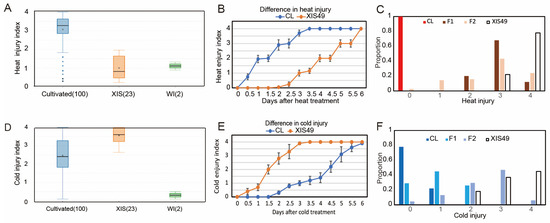 XIS cucumbers show extreme heat tolerance and cold sensitivity. (A) Comparison of heat tolerance in 23 XIS cucumbers, 100 cultivated cucumbers, and 2 wild cucumbers. (B) Gradual increases in heat injury were determined by their appearance during the heat treatment. (C) Heat tolerance of F1 and F2 population. (D) Comparison of cold tolerance in cultivated cucumbers, XIS cucumbers, and wild cucumbers. (E) Gradually increases in cold injury during cold treatment. (F) Cold tolerance of F1 and F2 population.