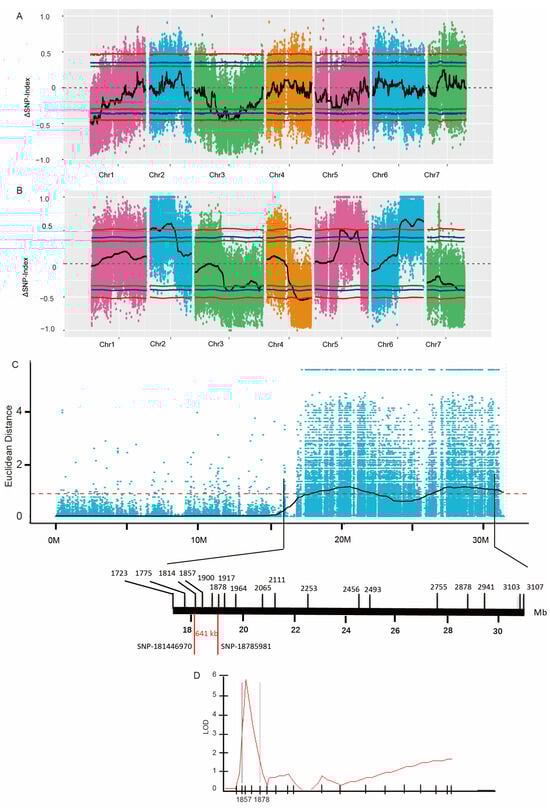 For the BSA-seq data processing, the DNA samples of the two parents and those of the two bulks in each QTL mapping system were subjected to whole-genome resequencing using the Illumina HiSeq platform. Duplicate clean reads were removed using the Picard tool (http://sourceforge.net/projects/picard/, accessed on 24 June 2021), and GATK v4.2.0.0) was used to perform local realignment and base recalibration to ensure the accuracy of the SNP detection [56]. The SNP loci between the test samples and reference genome were obtained using the GATK software according to the best practices listed on the GATK website (https://www.broadinstitute.org/gatk/guide/best-practices.php, accessed on 24 June 2021). All the SNPs between the test samples were summarized according to the alignment results of the test samples and the reference genome. The Euclidean distance (ED) [57] and Δ index [57,58,59] were subsequently calculated to identify the candidate regions of the genome associated with each target trait. The intersection of the linked regions defined using both algorithm methods (the ED and Δ index) and both marker types (SNPs and InDels) were defined as the final QTLs.