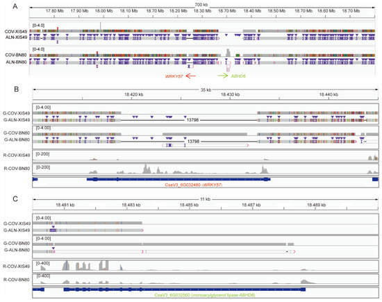 The QTL region LTT6.1 is rich in SNPs and SVs. Coverage track (COV) and alignment track (ALN) of XIS49 and BN80 genomes in the QTL region (A), WRKY57 gene (B), and ABHD6 gene (C). The inverted blue triangles indicate insertion markers. The color lines in coverage track and alignment track indicate mismatched bases.