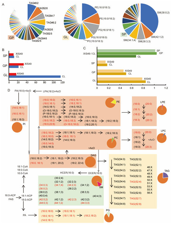 Lipids are critical components of the cell membrane, and there is a consensus on their roles in cold tolerance [29,30]. To elucidate the physiological mechanism of XIS49 cucumber cold sensitivity, we took CL cucumber as the control and assayed leaf lipids under LT treatment via liquid chromatography–tandem mass spectrometry (LC–MS/MS). The nomenclature of lipid molecules refers to a shorthand and standardized presentation system, which annotates the number of carbon atoms and double-bond numbers [31]. As many as 220 lipids were detected; these lipids belong to 14 subgroups and 3 groups, namely glyceryl phosphatides (GPs), glycerolipids (GLs) and sphingolipids (SP) (Table S8). The triglyceride (TAG) fatty subgroup, which includes 129 lipids and constitutes 29.8% of the total lipid amount, is the most abundant in the GP group; the most abundant TAGs are TAG49:2, TAG52:6, and TAG54:7 (Figure 4A). For the GL group, PE (16:0; 3), PE (16:0/18:2), and PG (16:0/18:1) were the most abundant; SM (38:0; 2) was predominant in the SP group (Figure 4A).