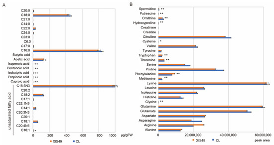 Content and composition of fatty acids and free amino acids in XIS49 and CL cucumber after 24 h cold treatment. (A) Fatty acids. (B) Free amino acids. * p < 0.05 and ** p < 0.01 indicate significant differences between XIS49 and CL.