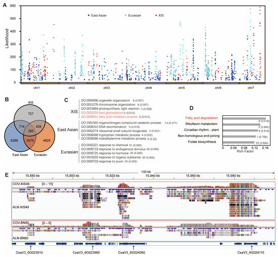 Lipid-related domestication in XIS cucumbers. (A) Selective sweep analysis of XIS group, EA group, and EU group by using resequencing reads of four groups of 115 cucumber accessions. IN group cucumbers were taken as a reference. Threshold value of domestication signal, top 1% composite likelihood ratio (CLR) value and 5% p-value. (B) Genome-specific selective sweeps were represented using Venn diagrams. (C) Top five GO terms in GO enrichment analysis by using XIS-, East-Asian-, and Eurasian-specific selective sweep genes. Gene number and p-value (in parentheses) were shown for each term. Lipid and fatty acid related GO terms were colored in red. (D) Top five pathways in KEEG enrichment analysis by using XIS-specific selective sweep genes. Gene number and Q-value (in parentheses) were shown for each pathway. Fatty acid related pathway was colored in red. (E) The four dSV genes (enoyl-CoA hydratase/3-hydroxyacyl-CoA dehydrogenase, EHHADH) enriched in fatty acid degradation pathway are clustered on chromosome 6 and show abundant diversity in gene sequence. COV, coverage track of targeted genome (XIS49 and BN80) to the reference genome CL. ALN, alignment track of targeted genome (XIS49 and BN80) to the reference genome CL. The inverted blue triangles indicate insertion markers. The color lines in coverage track and alignment track indicate mismatched bases. The mapped reads to the reference sequence were shown with their orientation below the alignment track. The color of the reads indicate reads quality, referring to published IGV for details [34].