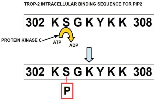 Binding sequence for PIP2 in the intracellular domain of Trop-2 between residues 302 and 308 [19]. Protein kinase C can phosphorylate serine 303.