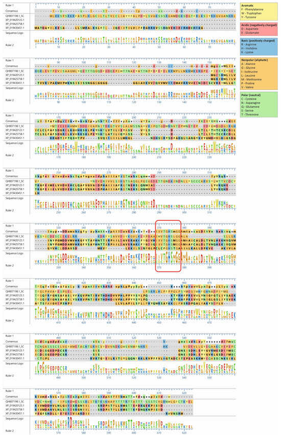 The amino acid sequence of the Atg15 (QHB07198.1_SC) yeast with 38 amino acid sequences of lupin lipases with predicted vacuolar localization was compared (Table 1). As reported previously, the Atg15 yeast possesses lipolytic activity and is involved in autophagic body degradation [11,12,13,14,23,24,25]. Our analysis revealed that three lupin lipases (XP_019430451.1, XP_019425758.1, and XP_019420123.1) had high amino acid sequence similarity to the Atg15 yeast (Figure 1). The degree of identity and similarity for the individual proteins to Atg15 was as follows: XP_019430451.1—16.5% and 32%, respectively; XP_019425758.1—18.6% and 28.5%, respectively; and XP_019420123.1—17.8% and 32%, respectively. The transcript of monoacylglycerol lipase-like protein (XP_019420123.1) was detected only in Andean lupin, whereas the other two lipases were present in both the white and Andean lupin species. These three lupin lipases with the highest amino acid sequence similarity to Atg15 are marked with red font in Table 1.