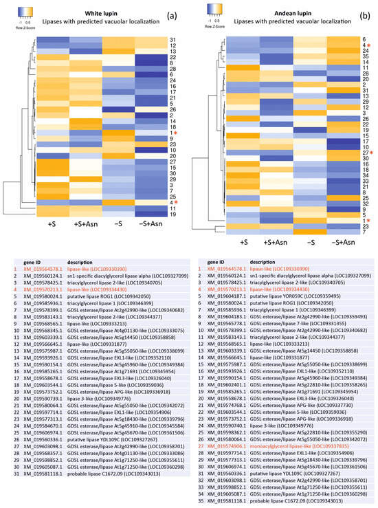 Heatmaps showing the relations in the levels of transcripts of the genes encoding lipases with the predicted vacuolar localization (Table 1) in the white lupin (a) and Andean lupin (b) embryonic axes cultured in vitro for 96 h on a medium with 60 mM of sucrose (+S) or without sugar (−S). The media were enriched with 35 mM of asparagine (+Asn). The asterisks and red fonts indicate the gene transcripts with close phylogenetic relations and amino acid sequence similarities to the Atg15 yeast (Saccharomyces cerevisiae) (Figure 1). The data represent the averages obtained from three independent experiments. The transcriptomics data selected for the preparation of this figure are presented in Table S3.