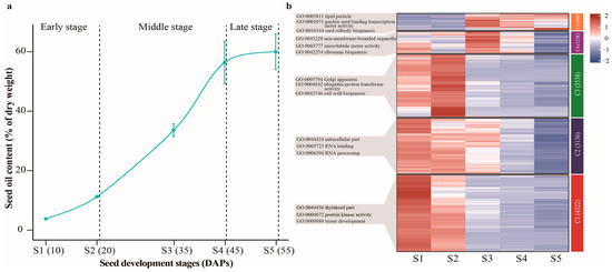 Characterization of castor seed oil and transcriptomic characteristics during seed development. (a) The oil content during castor seed development process. The whole seed development process of castor variety ZB306 was divided into three stages, the early (10–20 DAP, days after pollination), middle (21–45 DAP), and late stage (46–55 DAP). (b) Heatmap and hierarchical clustering of genes involved in five seed developmental stages. The colors represent the relative gene expression values after normalization adjustments. The red and blue colors refer to up- and down-regulation, respectively.