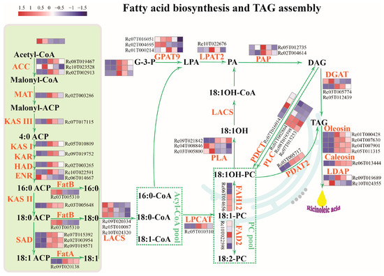 As mentioned above, oil biosynthesis could be summarized into two main processes: fatty acid biosynthesis and TAG assembly [36]. While 82 genes directly involved in fatty acid biosynthesis and TAG assembly were identified based on the genome data (Table S3), the key rate-limiting enzyme genes and regulators in developing seeds are still largely unknown. Acetyl-CoA is the major substrate for fatty acid biosynthesis in the plastid through multiple carboxylations. This process involves acetyl-CoA carboxylase (ACCase) subunits, including α-carboxyltransferase (α-CT, Rc10T023528) and ACC1 (Rc02T002913), as well as malonyl-CoA: acyl carrier protein malonyltransferase (MAT, Rc02T003286). The fatty acid elongase complex, which includes beta-ketoacyl-acyl carrier protein (ACP) synthase III (KASIII, Rc05T011217, Rc07T017115, and Rc09T020453), KASI (Rc05T010809), and KASII (Rc03T005648), is also involved in this process (Figure 3, Table S3). Based on the expression changes of genes at different stages of seed development, we identified 74 DEGs involved in fatty acid biosynthesis and TAG assembly (Table S3). Specifically, DEGs involved in fatty acid biosynthesis, such as RcACCase (Rc09T019602 and Rc10T023528), RcMAT (Rc02T003286), RcKASIII (Rc05T011217), RcKASI (Rc05T010809), RcKAR (Rc09T019752), RcHAD (Rc02T003265), RcKAR (Rc09T019752), RcKASII (Rc03T005648), and RcSAD (Rc09T019571 and Rc02T003954), are closely associated with oil accumulation during seed development (Figure 3). This strongly suggests that these genes may play a critical role in controlling oil biosynthesis in castor bean seeds.